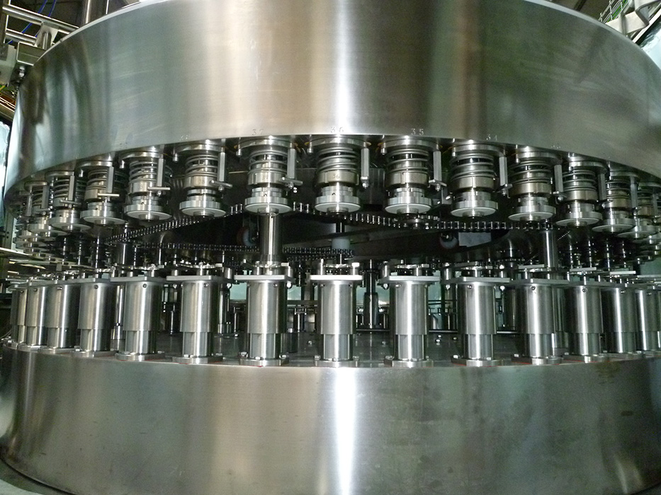 在灌装区域的开始处,容器被托盘举升并与灌装阀接触。