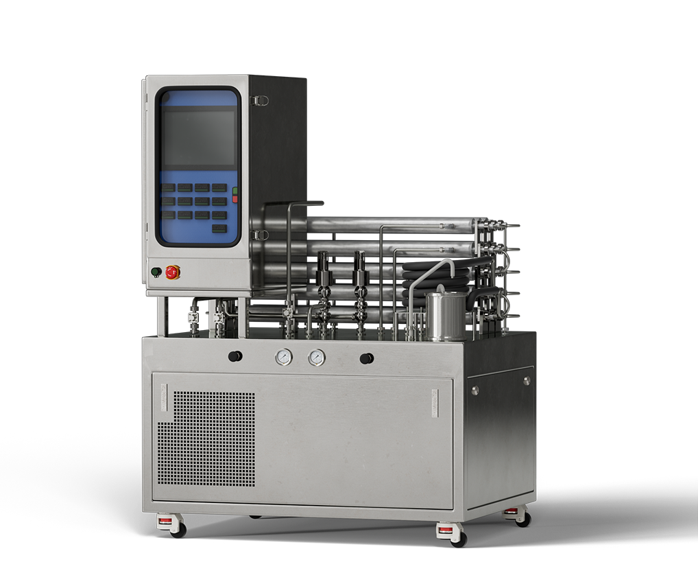 PT-20T系列UHT管式杀菌机完全模拟工业化生产状态,设计结构包括预热段、加热段及冷却段等。可根据客户要求配备在线均质及无菌充填。设备结构紧凑并自成系统,外设仅需自来水和电。控制面板集中控制,并可连接电脑通过软件对主机控制。管组件是根据企业特制标准制造,使物料形成一定的湍流,换热效率更高。