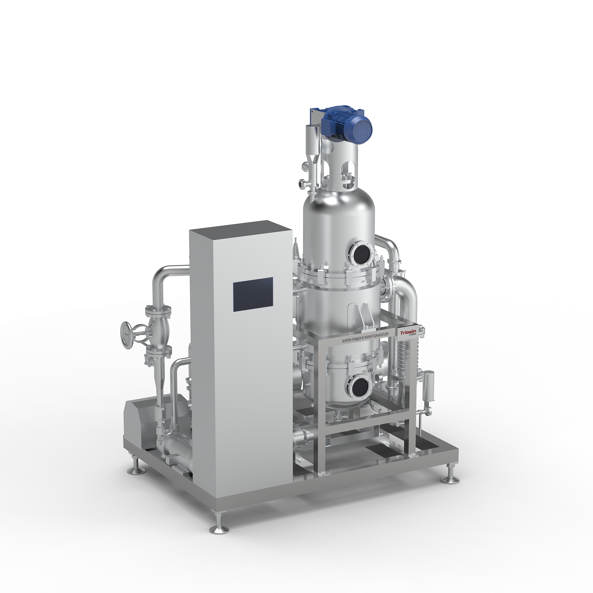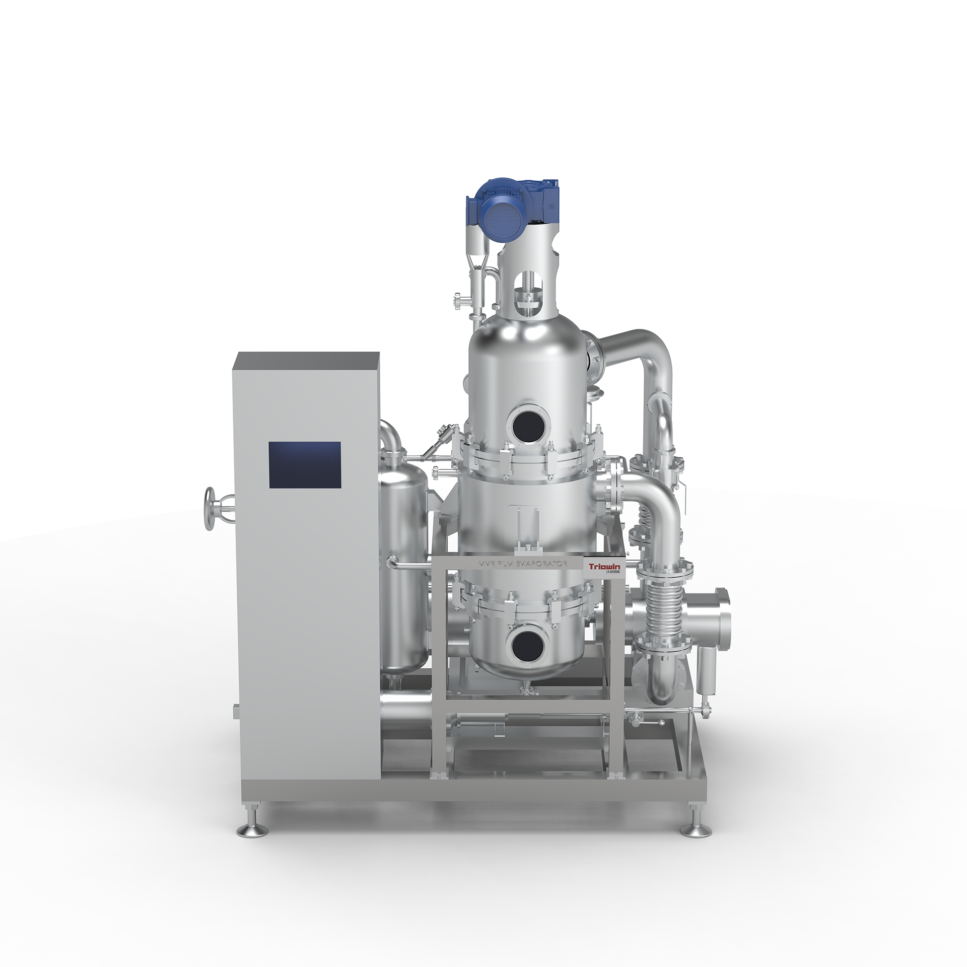 MVR薄膜蒸发器,它是一种适应性很强的新型蒸发器,对高粘度、热敏性和易结晶、结垢的物料都适用;MVR压缩机,其原理是利用高能效蒸汽压缩机压缩蒸发产生的二次蒸汽,把电能转换成热能,提高二次蒸汽的焓,被提高热能的二次蒸汽打入加热器为对物料进行加热,以达到循环利用二次蒸汽已有的热能,从而可以不需要外部生蒸汽,依靠蒸发器自循环来实现蒸发浓缩的目的。